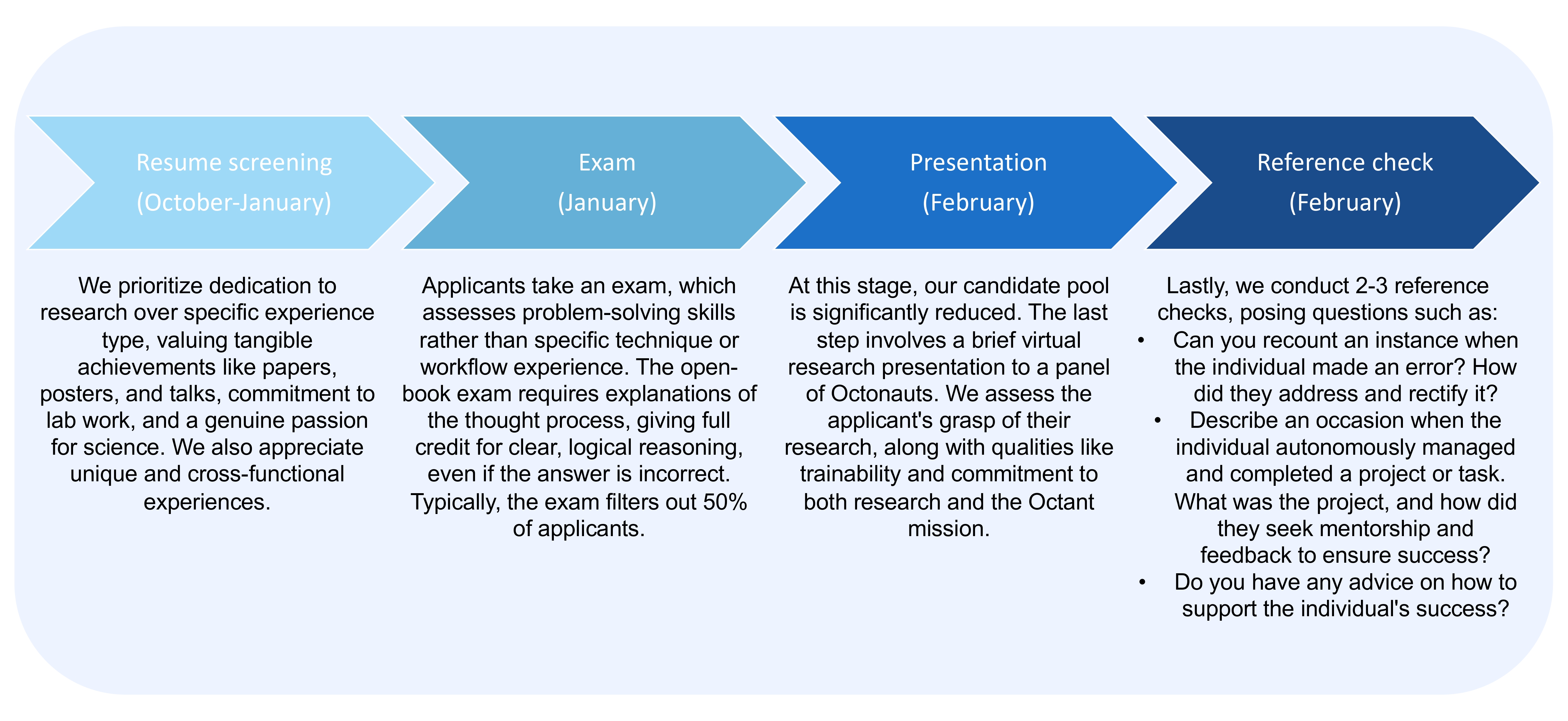 A quality class of OAs starts by recruiting a stellar group. Octant’s hiring philosophy generally looks for individuals who have the appropriate skills, passion, self-awareness, integrity, collaborative nature, and trainability. We set out to design a recruiting scheme against those criteria that was streamlined, fair, and rigorous. We’ve tweaked our approach over the years, and have had success with the following process: