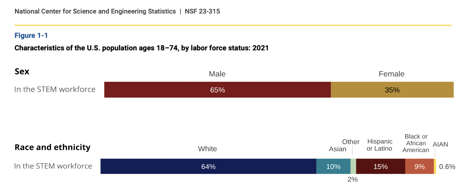 - National Center for Science and Engineering Statistics (NCSES). 2023. Diversity and STEM: Women, Minorities, andPersons with Disabilities 2023. Special Report NSF 23-315. Alexandria, VA: National Science Foundation. Available athttps://ncses.nsf.gov/wmpd.